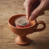 Set the glowing charcoal in your terracotta vessel. The handmade clay absorbs heat, protecting your surfaces.
