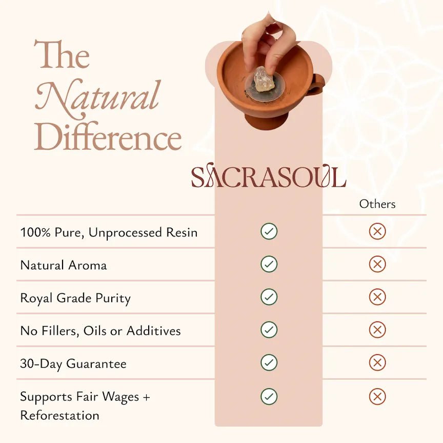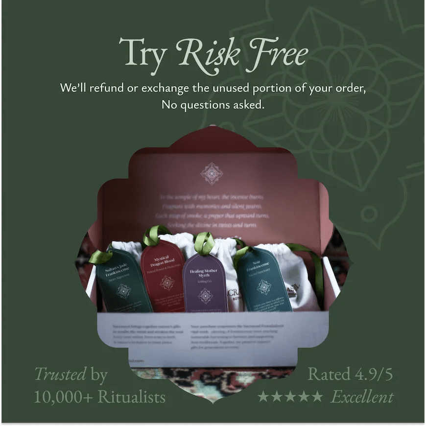 Try Sacrasoul Resins for 30 days. If you don't feel calmer, clearer, or more centered, we'll refund you. Fully.